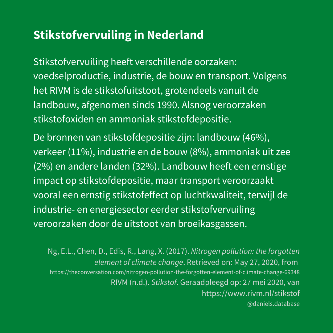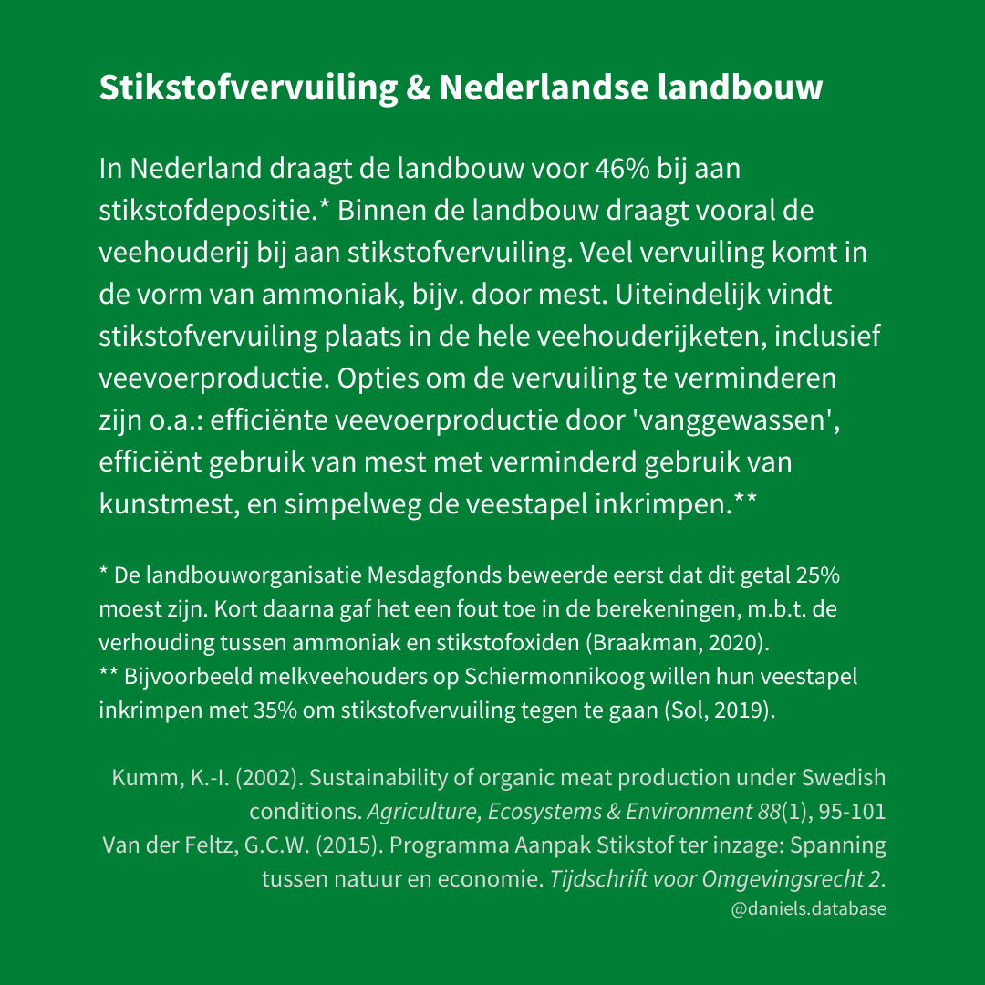 * De landbouworganisatie Mesdagfonds beweerde eerst dat dit getal 25% moest zijn. Kort daarna gaf het een fout toe in de berekeningen, m.b.t. de verhouding tussen ammoniak en stikstofoxiden (Braakman, 2020).